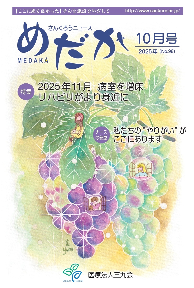 広報誌名「めだか」は、当院の中庭でみんなに愛でられ育つ めだか のように、親しんでいただきたいという思いから名付けられました。
